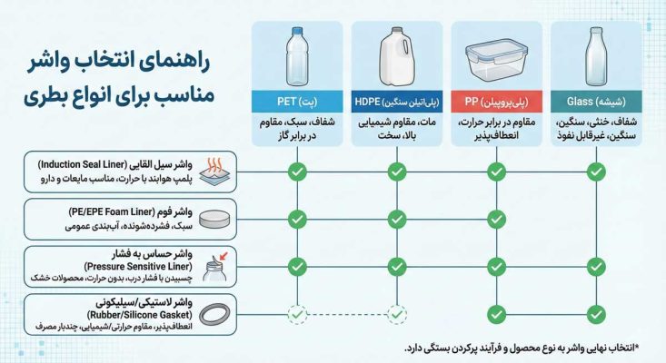 اساس کار سیل القایی بر مبنای ذوب شدن لایه زیرین واشر (Heat Seal Layer) و ادغام آن با لبه دهانه بطری است. اگر این دو ماده با هم سازگار نباشند، پیوندی شکل نمیگیرد. برای مثال، اگر بطری شما از جنس پلیاتیلن (PE) است، واشر شما حتماً باید دارای لایه لمینت مخصوص PE باشد. استفاده از یک واشر مخصوص ظروف PET روی بطری پلیاتیلن، مثل تلاش برای مخلوط کردن آب و روغن است؛ آنها ممکن است در ظاهر روی هم قرار بگیرند، اما هرگز به هم نمیچسبند.
