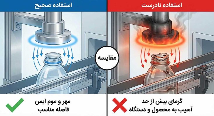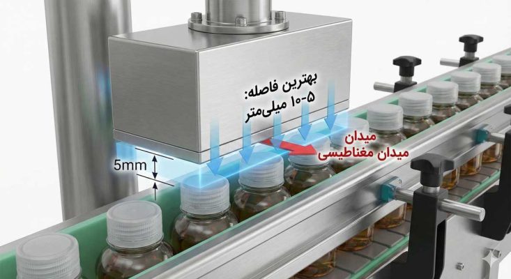 فاصله بین سطح بالایی درب بطری و کویل دستگاه باید ثابت و دقیق باشد (معمولاً بین ۳ تا ۵ میلیمتر، بسته به مدل دستگاه).