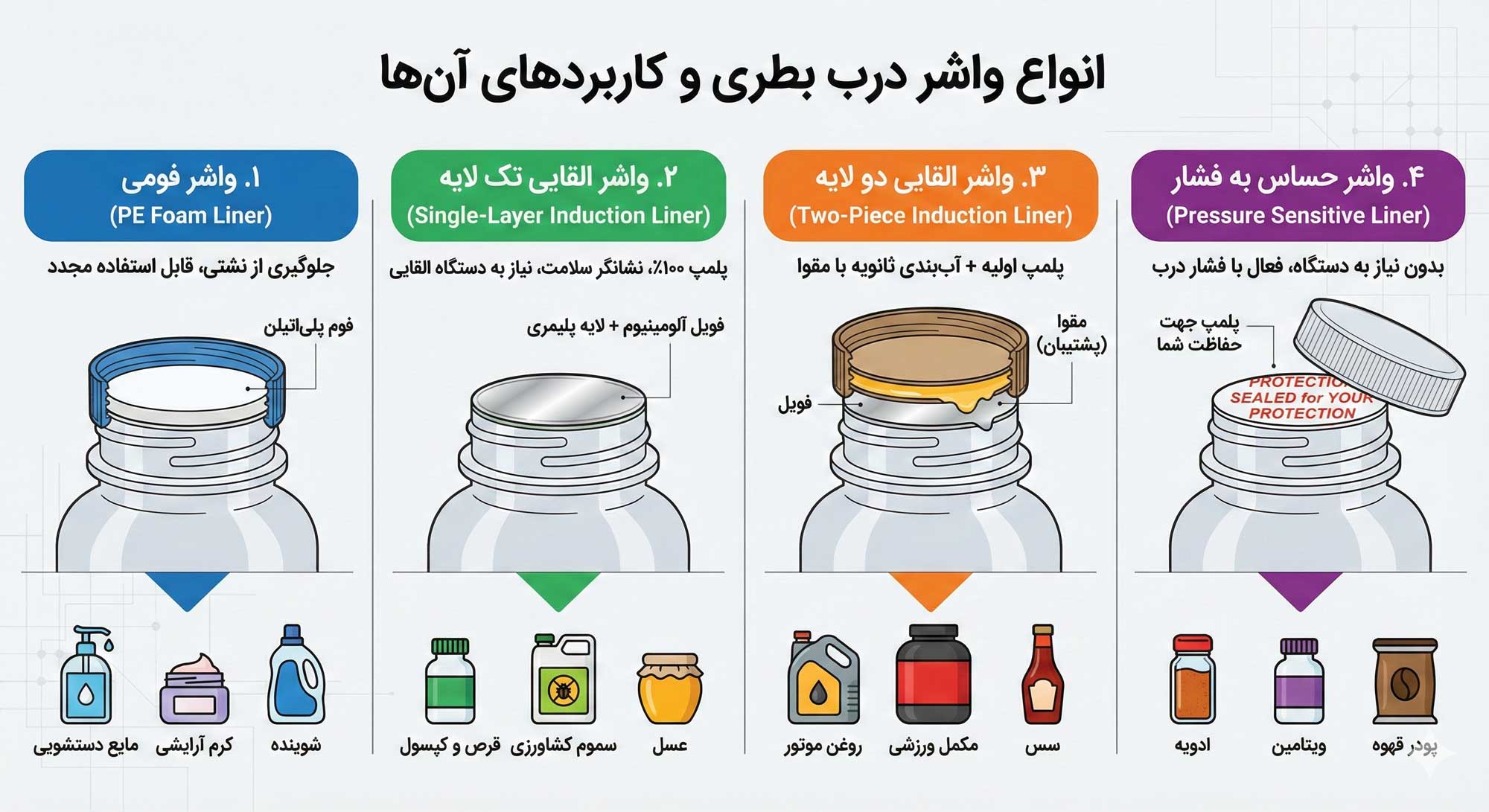 اگر بودجه خرید دستگاه سیل القایی را ندارید، این واشرها گزینه جایگزین هستند. واشرهای حساس به فشار (معمولاً از جنس فوم پلیاستایرن) دارای کپسولهای ریز چسب هستند که با فشار بسته شدن درب بطری فعال میشوند و به دهانه ظرف میچسبند. روی این واشرها معمولاً عبارت “Sealed for your protection” چاپ شده است. نکته مهم این است که این واشرها فقط برای مواد خشک (قرص، پودر، ادویه) مناسباند و برای مایعات کاربرد ندارند، زیرا چسب آنها در مجاورت مایع حل میشود.